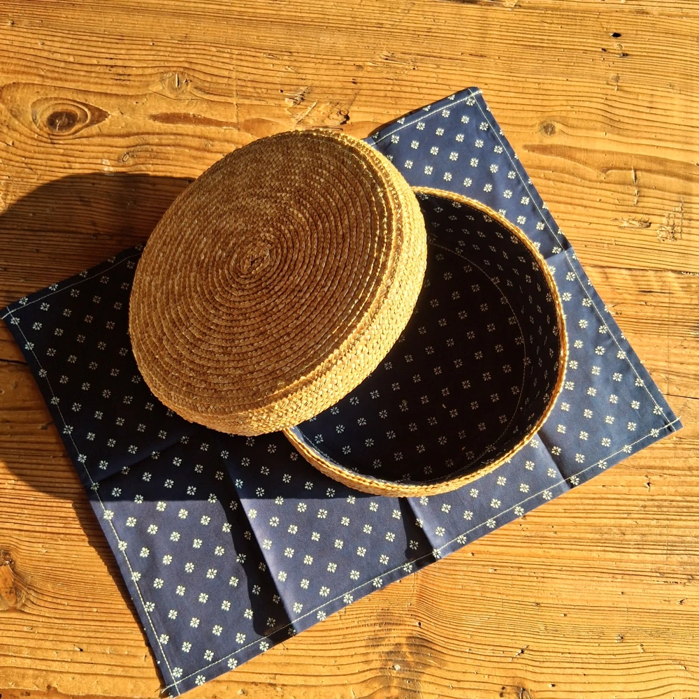 Kulatý chlebník ze slaměného úpletu v přírodním provedení. Výška chlebníku je cca 11 cm. Chlebník je uvnitř vystlaný látkou. Je vhodný na kulatý bochník chleba, nebo na jakékoliv jiné pečivo. Součastí chlebníku je i praktický látkový ubrousek se stejným vzorem, do kterého lze pečivo zabalit a ochránit tak před okoráním.