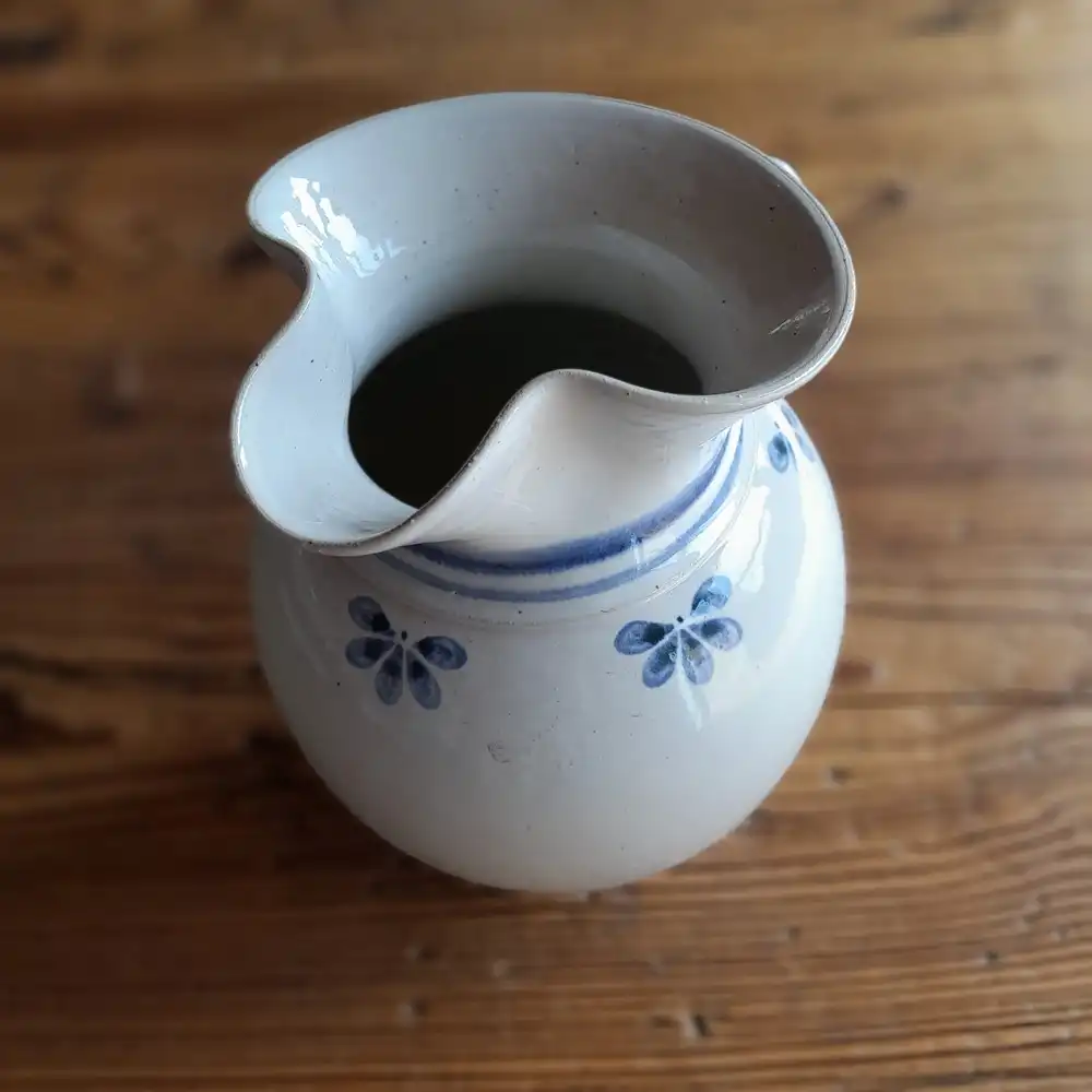 Modře zdobený kameninový džbán o objemu 1,5 l s lesklou glazurou. Výška džbánu je 20 cm. Džbán je vhodný na studené i teplé nápoje.