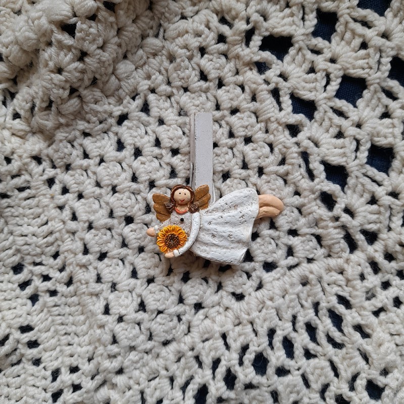 Dekorativní andílek na kolíčku. Roztomilý andílek se slunečnicí ozdobí Vaše psaní, vzkaz, kalendář či květináč. Velikost kolíčku s andílkem cca 7 cm (výška kolíčku) x 8 cm (délka andílka).