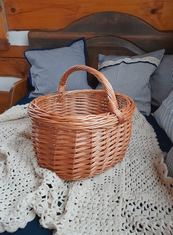 Světlý proutěný košík s uchem.