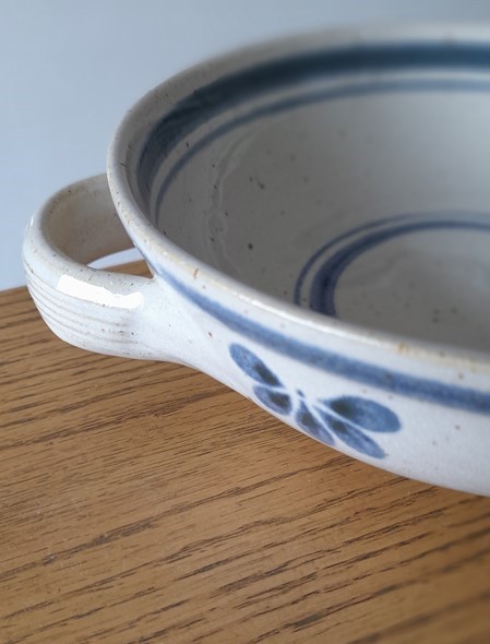 Nižší keramická miska s dvěma uchy. Uvnitř bílá s modrými pruhy. Zvnějšku lesklá bílá glazura s modrým zdobením. Miska se skvěle hodí na polévky, müsli, oříšky a další pochutiny.