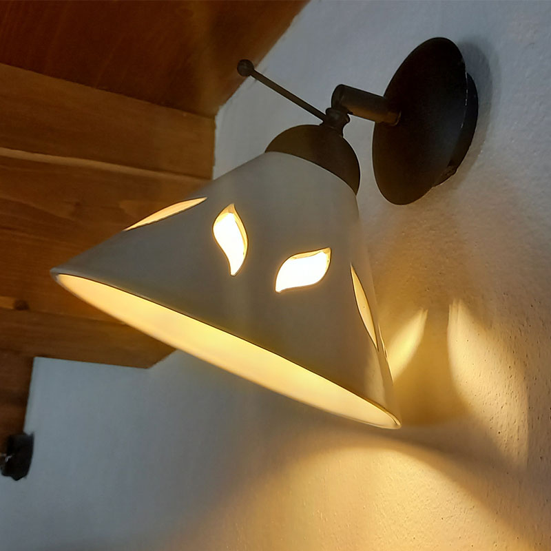 Nástěnné světlo ve venkovském stylu se zkoseným keramickým stínítkem o průměru 20 cm. Výška stínítka je cca 12 cm. Světlo vrhá zajímavé stíny a poskytuje více světla díky prořezu (prolisu) ve tvaru listu. Na přání je možné i jiný jednoduchý tvar prolisu. Za příplatek je možné stínítko doplnit i jednoduchým motivem, např. linkou viz vzorník.