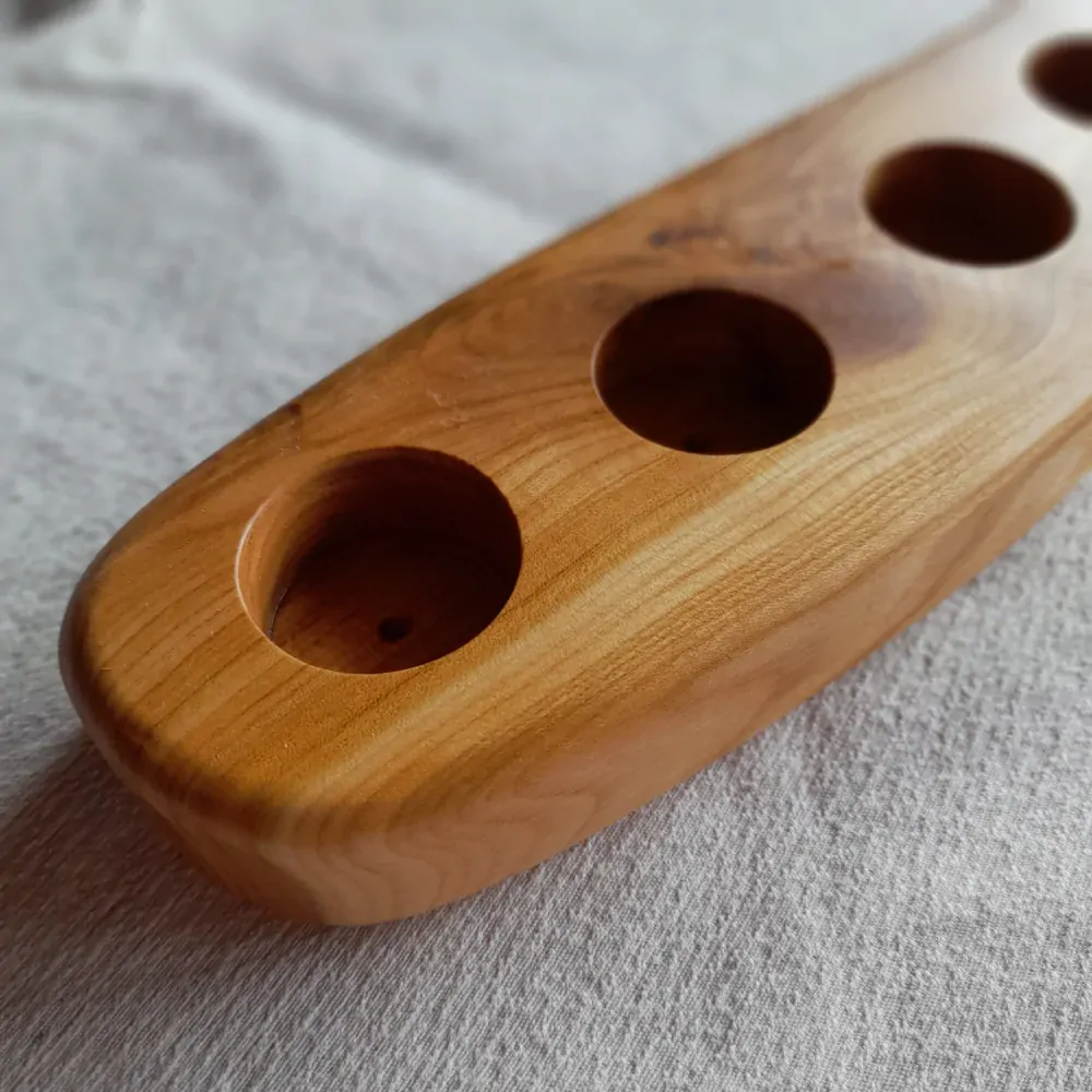 Ručně vyráběný podnos na panáky z třešňového dřeva. Podnos unese pohodlně a bez vylítí 4 panáky o objemu 2 cl. Panáky jsou součástí balení. Na podnosu jsou vydlabané otvory do nichž panák krásně zapadne a nehrozí tak převrácení či rozlití.