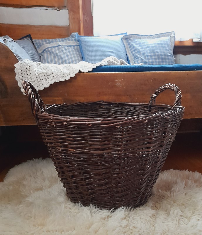 Proutěný tmavě hnědý koš s dvěma uchy.