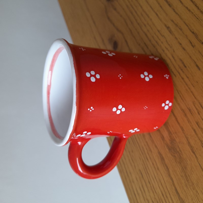 Majolikový hrníček dekorovaný malbou do syrové glazury. Hrníček je ručně vyráběný i malovaný a každý kus se tím stává originálem. Časem se mohou u hrnečku objevit v glazuře jemné prasklinky, které nemají vliv na použitelnost neboť jsou pro tyto výrobky typické. Hrníček je vhodný pro běžné používání. Může se dát jak do myčky, tak do mikrovlnky, ale nejlépe s ním zacházet podobně jako se sklem.