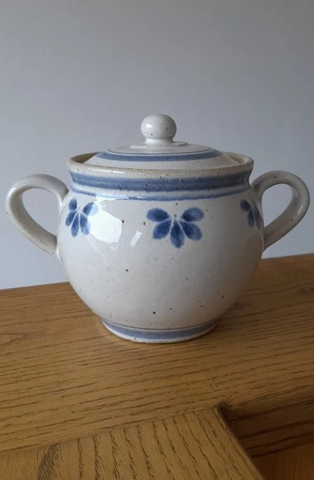 Keramická kameninová nádoba na sádlo či jiné pochutiny o objemu 1 l. S modrým zdobením a lesklou glazurou. Výška nádoby 13 cm. Průměr 13,5 cm. Sádlák je vhodný i do myčky nádobí.