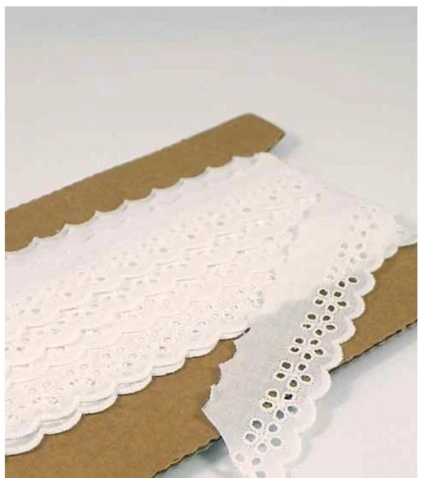 Jemná bílá bavlněná vyšívaná krajka neboli madeira je vhodná k ozdobení závěsů z kanafasu, polštářků, ubrusů nebo i oblečení.
