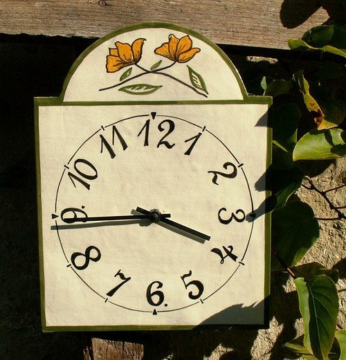 Ručně vyráběné a malované keramické hodiny v rustikálním stylu. Vyrobeny z kameninové hlíny, malovány pod transparentní glazuru a páleny na 1200°C. Podklad je přírodně bílý, malba v barvě středně zelené, černé a trošku teplé žluté - ale je možné i v jiných barevných kombinacích (viz vzorník).
