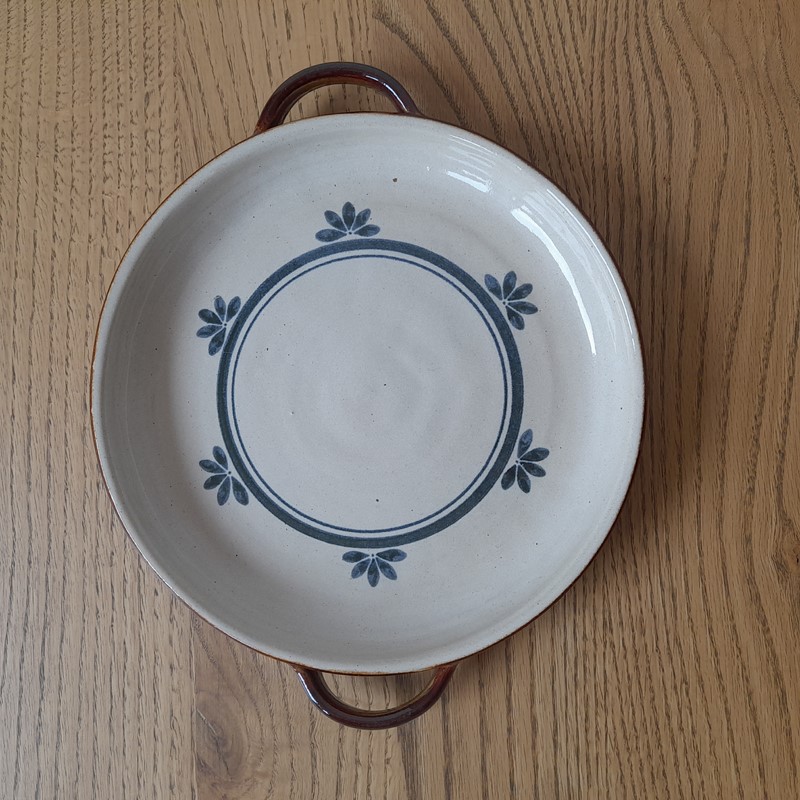 Nízký hnědý kameninový zapékací tác s lesklou glazurou a zdobením. Průměr tácu je 25 cm. Výška tácu cca 3 cm. Tác je vhodný do myčky nádobí.